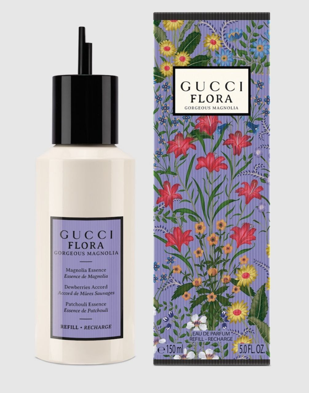 A refill for the Gucci Flora Gorgeous Magnolia eau de parfum. The fragrance brings out inner strength, highlighting the radiant and powerful Magnolia. To enhance the sweetness of the Magnolia Essence, a Dewberries Accord is added for a fruity, juicy dimension. Patchouli Essence is then used to ground the scent by striking a balance between freshness and sensuality. The sillage also features Blond Woods which provides a gentle, sensual touch. At the same time, Coconut Accord delivers freshness that is both smooth and addictive—finally, the Jasmine Sambac Absolute lands green intensity and warmth that comes together with trails of Musk.
