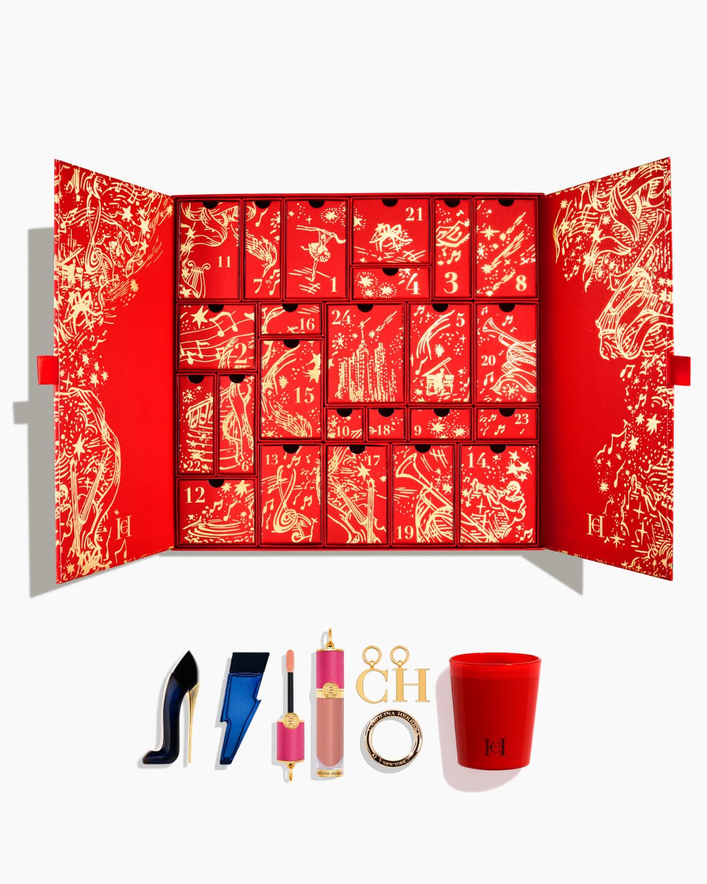 Celebrate the season in breathtaking style with 24 magical Herrera days. The 24-door advent calendar unveils a star-studded display of fragrances, beauty icons, and festive delights—from Good Girl and Bad Boy favorites to makeup must-haves like Fabulous Eyes Mascara and Good Girl Gloss, plus exclusive accessories such as charms, a lipstick ring, and a candle. An unforgettable countdown that makes every day a celebration.