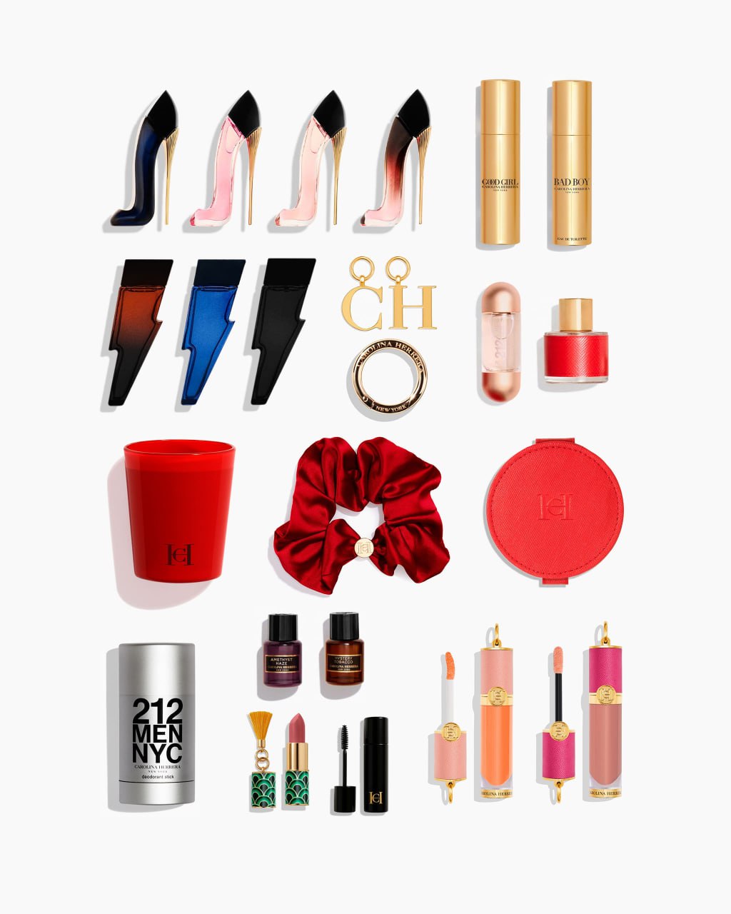 Good Girl 7ml Eau de Parfum, Very Good Girl 7ml Eau de Parfum, Good Girl Blush 7ml Eau de Parfum, Bad Boy 8ml Eau de Toilette, Bad Boy Cobalt 8ml Eau de Parfum Électrique, 212 VIP Rosé 8ml Eau de Parfum, CH 8ml Eau de Toilette, Bad Boy Elixir 8ml Eau de Parfum, Very Good Girl Elixir 7ml Eau de Parfum, Good Girl Travel Spray 10ml Eau de Parfum, Bad Boy Travel Spray 10ml Eau de Toilette, 212 Men Deodorant Stick, Herrera Confidential Mystery Tobacco 5ml Eau de Parfum, Herrera Confidential Amethyst Haze 5ml Eau de Parfum, Good Girl Blusher in Rose Jasmin 1070, Good Girl Gloss in Orange Delight 985, Fabulous Eyes Smudgeproof Mascara , Fabulous Kiss Blus Matte Lipstick in 741, C & H letter charms, Hair tie, scented candle, compact mirror, lipstick bangle.