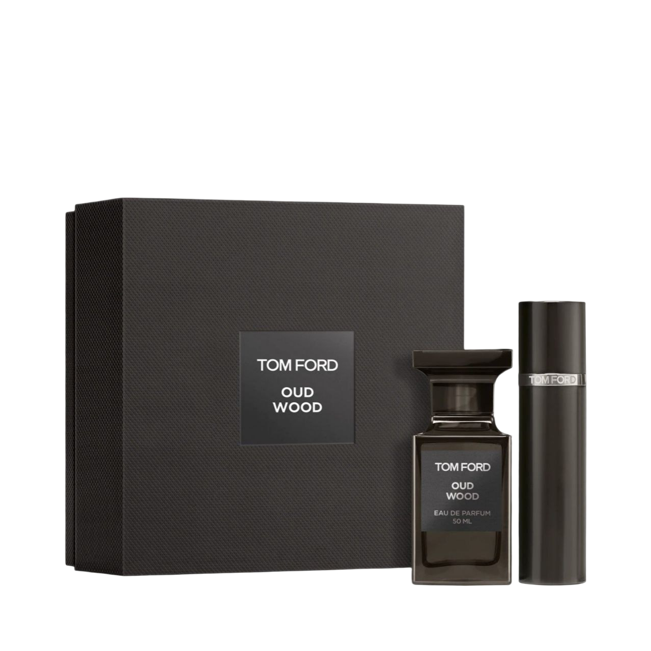 Gift Oud Wood, a modern masterpiece. This amber woody scent features oud notes, woods and spice. The gift set features 50mL eau de parfum bottle and 10mL travel spray.