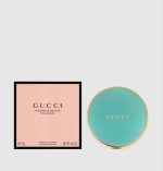 Encased within an aqua blue click compact with Gucci logo and mirror