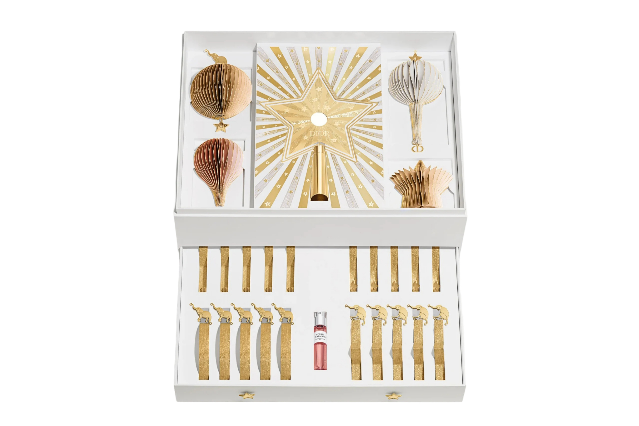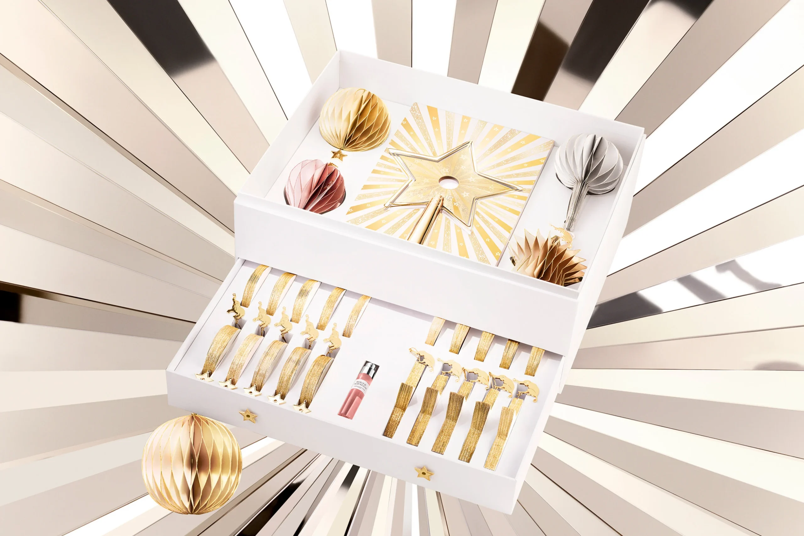 The 24 decorations, adorned with glitter and delicate details, come in four shapes inspired by the House’s heritage ornaments imagined by artist René Gruau. They shine in three gold tones—yellow gold, rose gold, and white gold—with a pleated design that subtly reveals a harlequin motif, a nod to the circus universe so dear to Christian Dior.
