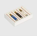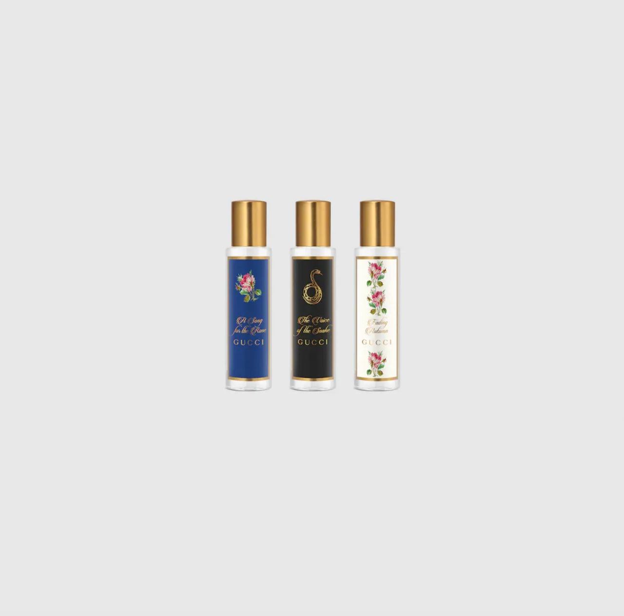 Gucci’s Haute Perfumery line, The Alchemist’s Garden unfolds within an imagined laboratory filled with curious jars and mesmerizing scents. The customizable collection made up of eaux de parfum, perfumed oils and acque profumate (“scented waters”) is inspired by the art of alchemy and fragrance-making, formulated to be layered and blended to create a unique, personalized fragrance combination. Built around a hero ingredient linked to the House’s distinctive codes, each scent can be magnified, muted, or fused with other fragrances from the luxury collection to create a one-of-a-kind sillage. This discovery kit includes two eau de parfum and one scented water in mini sizes of the line’s most recognizable scents, allowing you to try, wear, or gift different perfumes in one box.