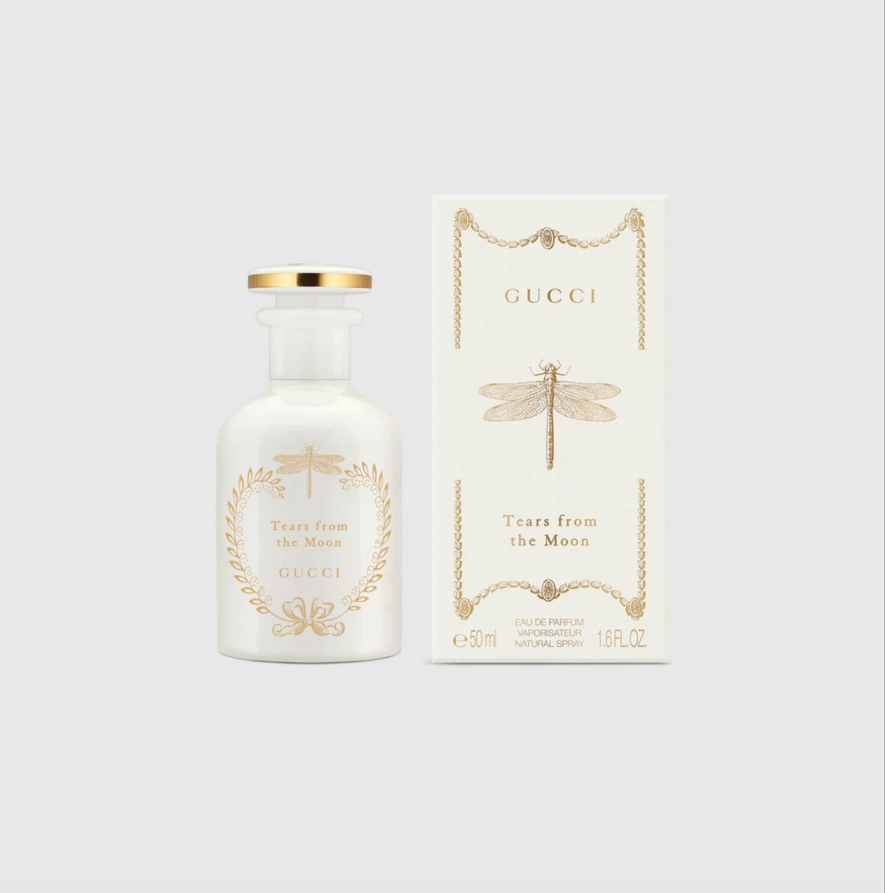 Inspired by the first perfumery containers from antique apothecaries, Tears from the Moon fragrance is encased in a white glass flacon, adorned with a dragonfly, decorative gold foliage, and a green bow at the bottom of the bottle.