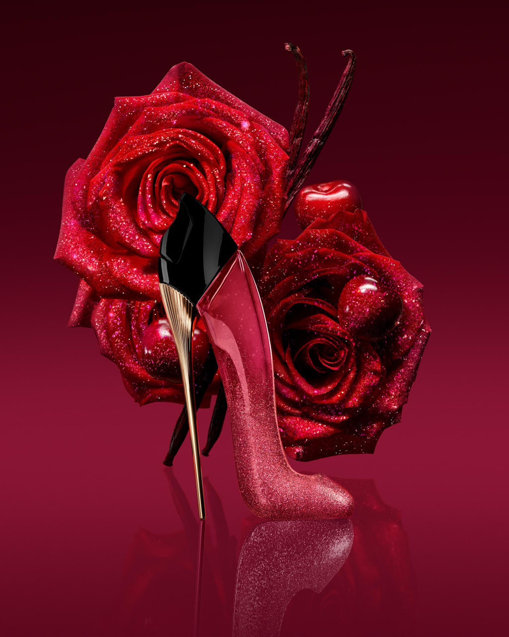 The Very Good Girl Glam perfume opens with intense cherry top notes, echoed in the shimmering stiletto bottle. Upcycled rose water accentuates the feminine heart of the fragrance, transforming the Eau de Parfum into a concentrated perfume. A base of sustainably sourced vetiver and Bourbon vanilla provides contrast and adds further dimension.